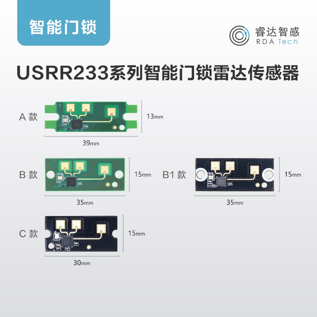 USRR233系列具有较低的功耗和较高的抗干扰能力,实现对周围环境的精准感知,可广泛用于移动目标感应的各种场景,非常适合智能门锁、智能门禁、智能考勤机等应用场景。