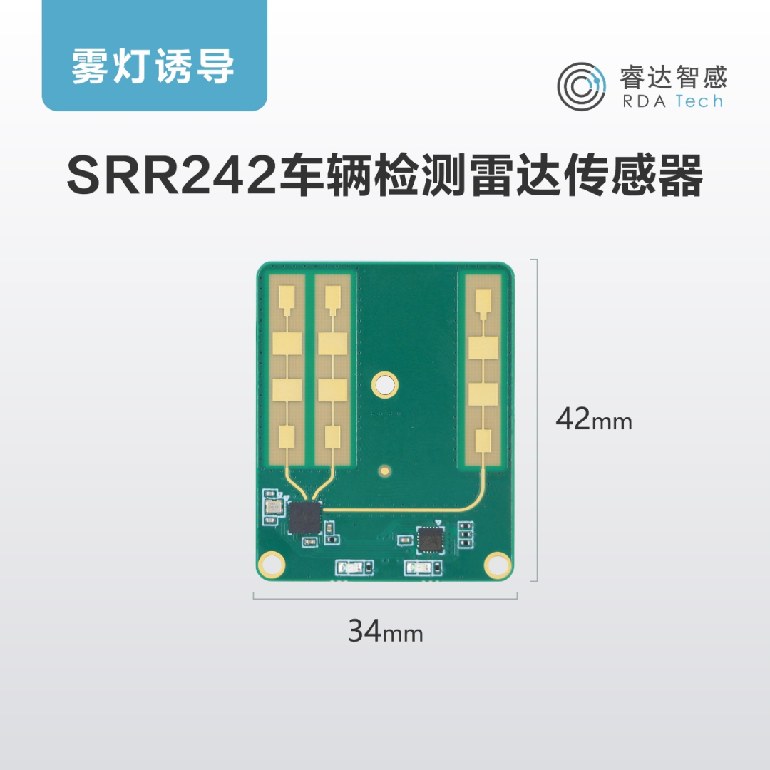 雾灯诱导首选:SRR242 是一款高性能、低功耗的 24GHz 车辆检测雷达传感器,检测距离不小于30米, 采用FMCW调制模式,天线一发两收,可检测 目标的距离和方位,对车道上移动、静止车辆 目标进行精准检测。